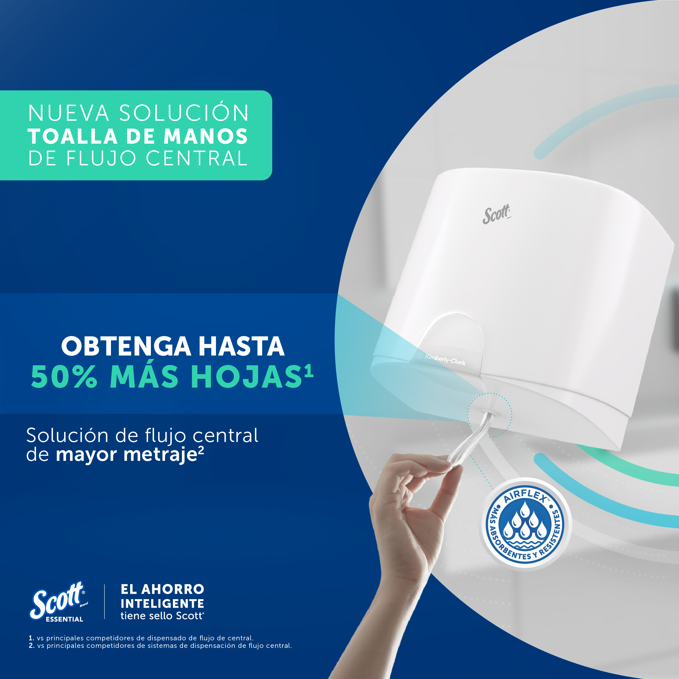 Obtén hasta un 50% más de hojas mientras cuidas la higiene de tus usuarios con la nueva solución de Toalla de Manos Scott Essential Flujo Central, con sistema de dispensación controlada uno a uno. Toma el control de tu presupuesto con más hojas, más metros* y más sostenible en tu compañía