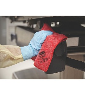 Los paños de microfibra HYGEN™ para todo propósito de Rubbermaid Commercial Products tienen talladores que remueven polvo al sacudir, y absorben mejor los líquidos cuando se limpia en húmedo. Cuando se usan con el método de doblado en 8, los paños limpian efectivamente un área mayor. Sus bordes con doble acabado y costuras dobles mantienen su forma y brindan gran durabilidad.
