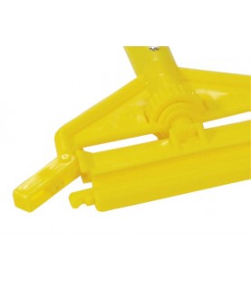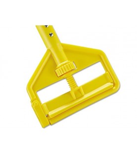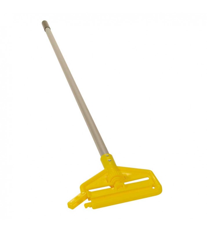 Debe usarse con mopas de banda de 12.7 cm Posee mango de sujeción lateral, cabeza grande de plástico amarilla y mango de aluminio con recubrimiento.
